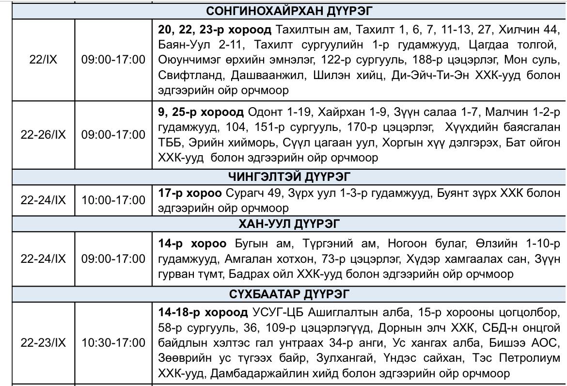 Улаанбаатар цахилгаан түгээх станц” ТӨХК цахилгаан шугам тоноглолд засвар, үйлчилгээ хийнэ. Энэ үеэр дараах дүүргийн зарим хороонд цахилгааныг тодорхой цагаар хязгаарлана. Хуваарийн дагуу өнөөдөр цахилгаан түр хязгаарлах газруудыг танилцуулж байна.